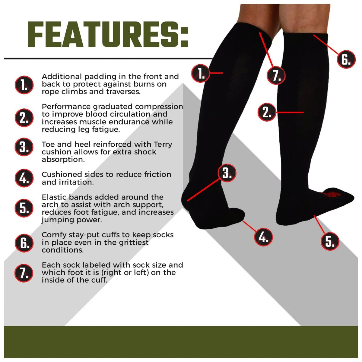 - DESIGNED FOR MILITARY USE:: No visible logos or words to meet military protocol. These are the same socks as our standard High Compression Socks that excel in races like Spartan, Tough Mudder, Savage, BoneFrog, Warrior Dash, etc. Which means they love the mud, water, and tough terrain! Our high knee compression socks have extra padding in the front around the shin and a padded strip down the back of the calf to help prevent burns and bruises from rope climbs and traverses. PLUS, They drain water extremely well which is a huge Benefit for when you do encounter water!