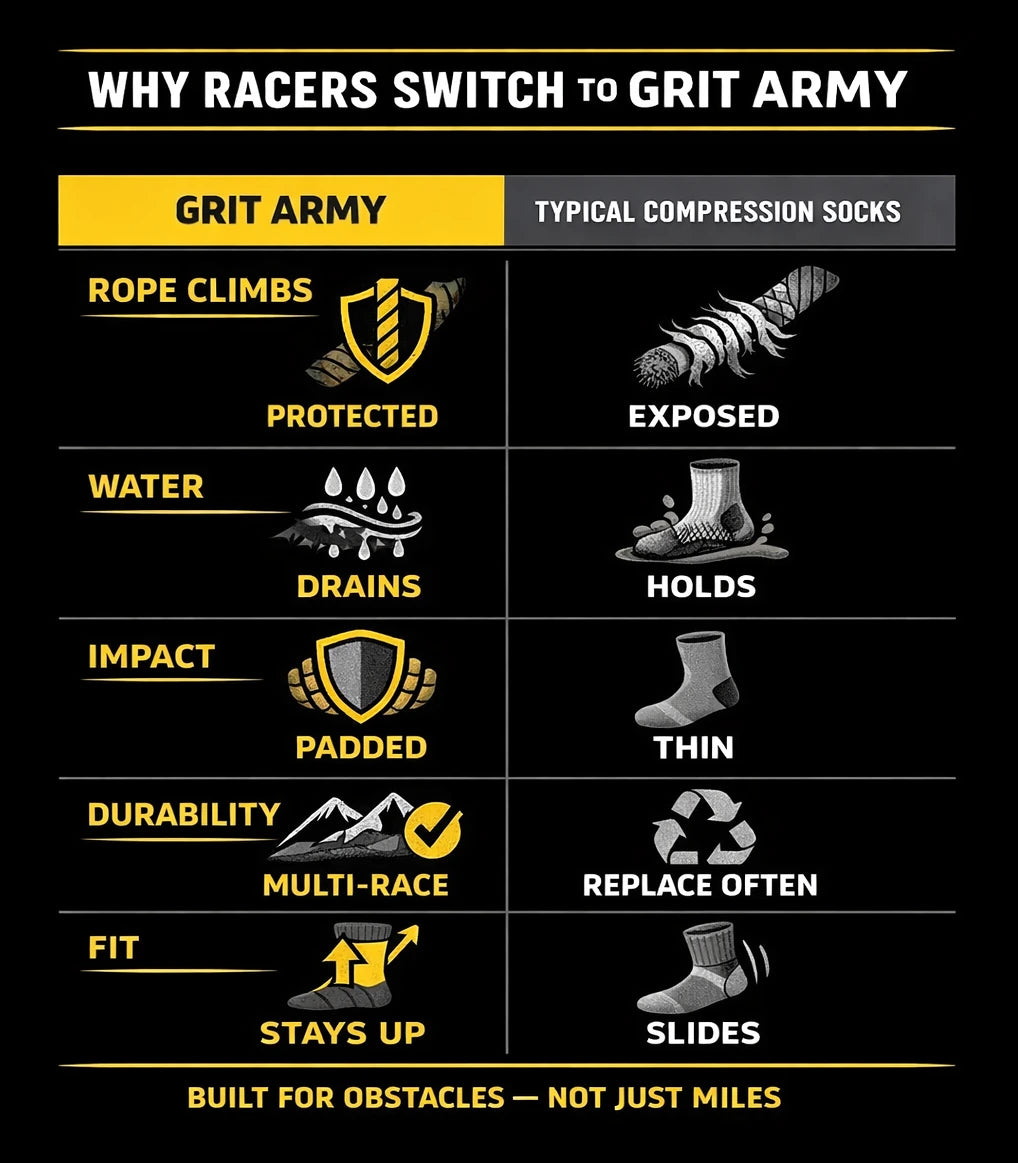 Designed to survive rope climbs, mud, water, and the toughest races — so your feet don’t become the weak link on race day.